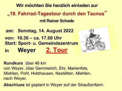 2. Tour: 18. Fahrrad-Tagestour durch den Taunus mit Reiner Schade Kontakt: Rainer Schade T 06771–1270 E-Mail: rg.schade@t-online.de Rundkurs über 46 km von Weyer, über Gemmerich, Ehr, Marienfels, Miehlen, Pohl, Ho... D. Zorbach 14.08.22, 10:30 - 17:00