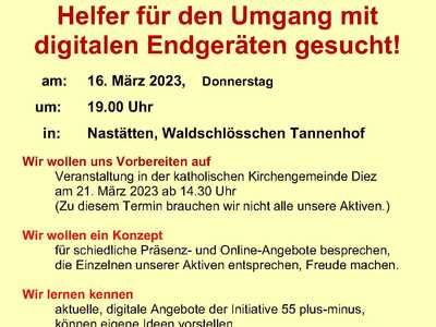 2. Treffen: Digitale Herausforderungen, Anwendungen nicht nur für Ältere in unserer Region Das 2. Treffen ist ein Planungstreffen in Nastätten, im Restaurant - Hotel Waldschlösschen - Tannenhof, Tannenhof 1. Wir wollen ein Konzept und Ang... D. Zorbach 10.11.22, 19:00 - 21:30 Tannenhof 1, Nastätten Umwelt, Technik, Naturwissenschaften