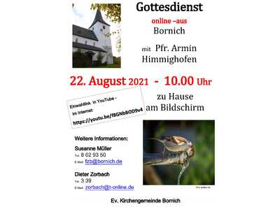 Onlinegottesdienst mit Pfr. Himmighofen in Bornich Online Gottesdienst in Bornich. Einwahllink bei YouTube: https://youtu.be/f8GNbBOD9v4 D. Zorbach 22.08.21, 10:00 - 11:00 Weltanschauung Gottesdienst Bornich