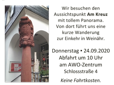 Die Wanderung übers Kreuz nach Weinähr startet am Donnerstag, 24. September, um 10 Uhr, mit der Abfahrt vom AWO-Zentrum in der Schlossstraße 4. Zur besseren Planung ist eine Anmeldung erforderlich unter 02604-9419111 (Anrufbeantworter) oder per EMail an die Adresse awo_nassau@online.de. Die Anmeldung ist auch unter 0171-4120648 (Herbert Baum) möglich. Bei unpassendem Wetter wird die Wanderung verschoben.